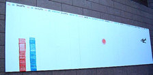 日比野さんがマイクを持った。「ビルの赤と青、アクリル絵具のベチャッとした質感がアメリカのイメージです。さまざまな色を混ぜ、小さな窓をいくつも描くことで、いろんなドラマや表情を込めたかった。そして描いていて感じたのですが、高いところを描こうとすると不安定なんです。どんどん背伸びして高いものをめざして、その不安定さというかバランスの悪さを気合いにして、アメリカはここまで来た。さらにブッシュになって、強いアメリカをやたら強調するようになった。今回の事件は、『強いアメリカはいつまでも続かない』という暗示ではないのか、と思ったりします。だから、青いビルを描いたときは、わざと不安定を強調するためにふらつきながら描きました」