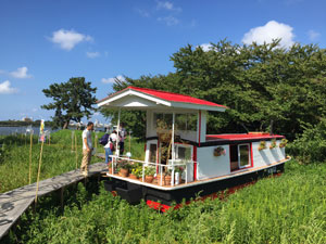 ボートだけどハウスなこのボートハウスを最近、日本で作ってみました。場所は新潟市の鳥屋野潟です。陸地と水辺の間の潟が新潟市には沢山あります。そこにボートハウスを建造しました。普段は誰も足を踏み入れない潟にボートハウスを設営して、ウッドデッキの道を作って新潟市民に開放しました。