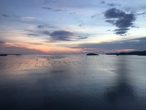 翌朝、南三陸の日の出を見ようと、夜明け前から海を眺めていた。雲が赤く染まり出し、海の姿が見えてきた。水面
