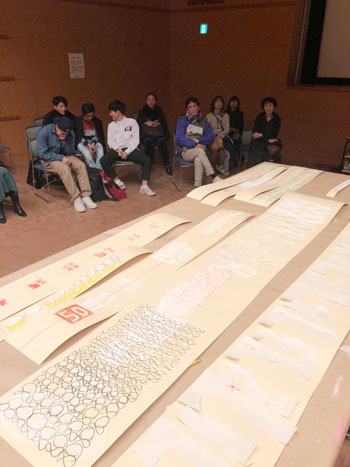 その大阪万博のテーマは「いのち輝く未来社会のデザイン」。高齢化社会、ダイバーシティー、医学、AIなどがキーワードになってくるEXPO2025である。公開制作の会場には高校生から年配者まで各年代の方々が程よい感じで50人くらいかな、混ざり合っていた。午後1時から6時までの予定。会場に来ていた人に、今夜大阪万博開催を決まる会議がパリであることを話したら、ほとんどの人は知らなかった。当然テーマも。なので、この公開制作の時間で大阪万博が開催できるようにみんなでテーマについて考えてみるかということを促しながら、「人口ピラミッド」をモチーフとした立体作品をつくり始めた。
