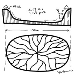 久しぶりに岐阜市の実家に泊まった。台所が改装されて使いやすくなっていた。去年の夏に長良川で甥のゆうじと捕まえたメダカが大きくなっていた。両親には変わりはなかった。朝8時に岐阜駅から東海道本線で大垣へ向かう。駅に着くと養老天命反転地のスタッフが迎えに来ていた。今日はそこでワークショップを行う。ここは現代美術家の荒川修作さんが作った、平坦な地面のないゆがんだ公園である。その特徴を生かしたワークショップを去年から私が行っており、今年が2回目である。今年のタイトルは「引っ張られた垂直線」、去年は「引っ張られた水平線」。去年は綿で糸を編みこんで空中に線を描いた。今年は地面に水を垂らしながら、その軌跡をなぞっていき、その形を描いていった。80人の人間がアリンコのように地面にはいつくばって水を垂らしてはその線をなぞっていく姿が朝10時から夕方4時まで続き、最後にはすり鉢状の東京ドームほどの大きさの公園に引っ張られた垂直線が描かれた。