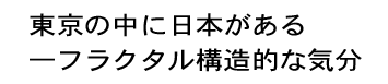 しかし一方では新たな視点も表れて来出したのです。それは「東京の中に日本がある」というフラクタル構造的な関係性です。私の知っていた東京は実にごく一部であり、東京を構成している地域性、そしてその関係性は日本の首都という名のもとにおいて覆い隠されていた実に多種多様な集合体であったのではないかという見方です。