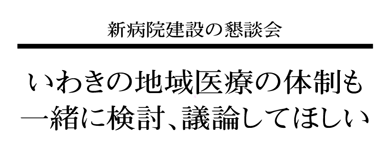 いわきの地域医療全体を見据えた話し合いは市地域医療協議会が担い、懇談会と協議会での検討を相互にフィードバックさせるという。しかし来年7月には新病院建設の基本構想の素案取りまとめをする予定で、懇談会と地域医療協議会が車の両輪としてうまく機能するかが課題で、その二つの会をどうつなげ、さらに保健所や消防も同じテーブルについて真剣に話し合える場が必要になる。
