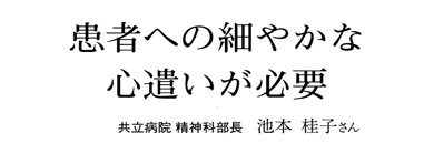 池本さんが共立病院に来て感じるのは、患者への細やかな心遣いの足りなさ。幻聴や錯覚がみられる意識混濁の患者の手足を当たり前のように縛っているのには驚いた。縛ることが却って、暴れる原因にもなる。それに「精神科」という名称。県立医大では身心医療科と変えている。共立病院の場合、常磐病院と同じにリエゾン科がいいかもしれない。