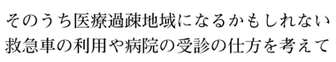 特別な医療に関して、ブラックジャックがいてもいい。でも、ブラックジャックはすべてを背負えない。日常のことは地域で背負っていかないといけない。地域の安心が病院の仕事と思っている。市民が医療機関の利用の仕方を考えないと、救急をはじめ、ほかの地域に頼らなければならなくなる。