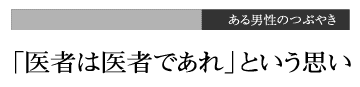 「立場上」ということで再び「ある男性のつぶやき」ということになった。今回は医師である。言葉が熱く筋金入り。これまで培われてきた「ドクタースピリット」がビシビシと胸に響く。