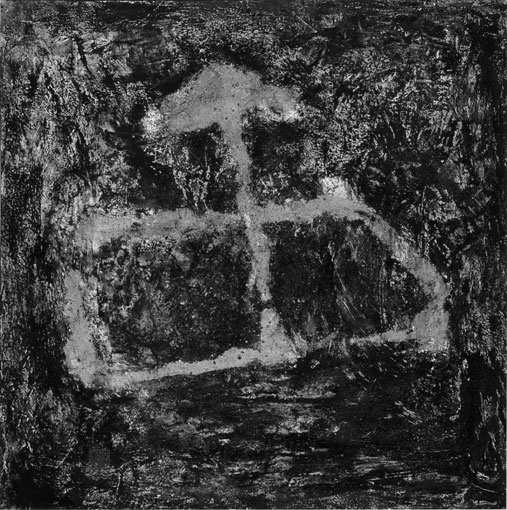 1987年7月のある日。鷹見は東京・国立市の街はずれにあるギャラリー「KIGOMA」を訪れた。小さなビルのペントハウスにある3坪ほどの空間。1ヵ月ほど前にたまたま手にしたDMに「火薬画」の文字があり、それに惹かれて訪ねたのだった。わかりにくい場所で見つけるのに苦労したが、扉を開けると、そこはまるでほの暗い洞窟のようだった。壁はほとんどが大きな絵で埋まっており、褐色や群青の背景から象形文字のような人型や天体らしいかたちが浮かびあがっていた。「まるで原始絵画が渦巻く洞窟にでも入ったようだ」。鷹見はそう思った。