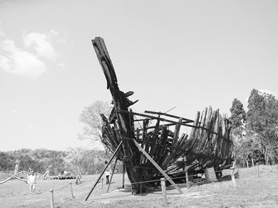 いつものメンバーで館跡に運び上げ、組み立てたまではよかったが、溶接したときの火種がどこかに残っていたらしい。山の頂から火が上がり、井戸があった場所から水を運んで消し止めた。船首部分を焦がしてしまったとはいえ大事には至らず、蔡が指示して組み立て直した。