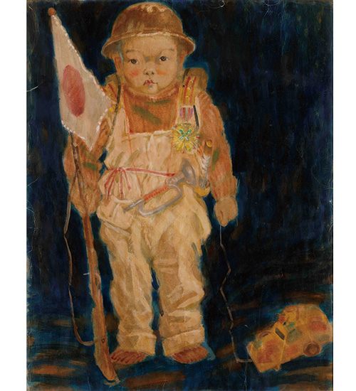 会津若松で生まれ育った渡部菊二(本名は菊次)の「戦国の少年」。昭和18年の白日会に出品した1点で、その年に同一人物と思われる少年が白い防空頭巾をかぶり、右手に軍人が描かれた凧を持つ「防空頭巾」も制作している。翌年にはジャワの女の子が日の丸を掲げた「ヒノマル」を描いた。