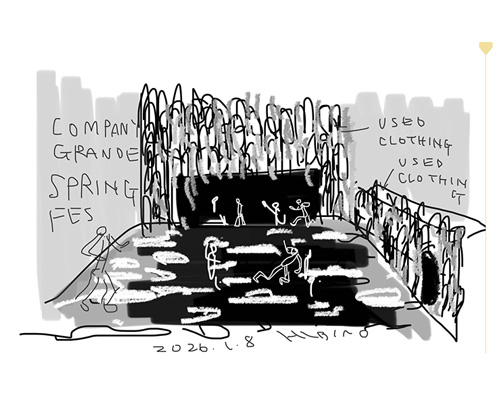 桟橋に船がやってきて、そこに乗り込んで行く。フェリーなので車や郵便バイク、そして荷物はお米とか、食品とか、宅急便とか。船員がロープを操り、船を桟橋に留めたり、離したり…。船が出ると、今までいた場所は遠くなり、目的の島が近づいてくる。「桟橋と船、いいね!」。近藤さんはずーと、オンライン中継の画像を見ながら、舞台のイメージをスケッチし始めました。